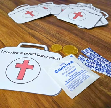 I personally love using props as an extra addition to really bring the story together! Your props don't need to be elaborate to keep children engaged. I have used backdrops before but with this month's lesson I put together some simple things that you might already have laid around the house! In the Story of the Good Samaritan, the Samaritan man bandaged up the Jewish man who was robbed and beat near to death. For some props I set up a small table with a first aid kit that I already had at home, a bottle of olive oil and a plush donkey I ordered from Amazon (link will be left below) as well as a bag of fake golden coins that I had from previous stories. At the end of the story, I wanted the children to have something to take home that would help them remember what they learned from the lesson. I designed printable doctor bags as a craft that say, "I can be a good Samaritan". These made perfect gift baggies that I filled with band aids, gauze and golden coins. These were pre-colored but there is a black and white version for children to color on their own.