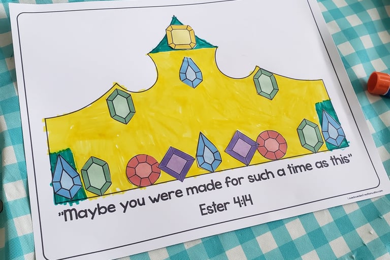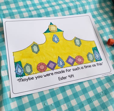 Crown Craft: Provide materials for kids to create their own crowns as a symbol of Esther’s royal status. Use gold paper, stickers, and jewels, or glitter to decorate. For this week's lesson I designed a printable crown craft to download, they can use the jewel template provided to decorate or add their own.